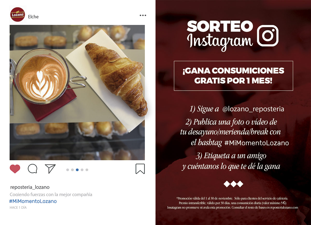 2) Publica una foto o vídeo de tu desayuno/merienda/break, en nuestras confiterías de #Elche, con el hashtag #MiMomentoLozano 📸☕🥐